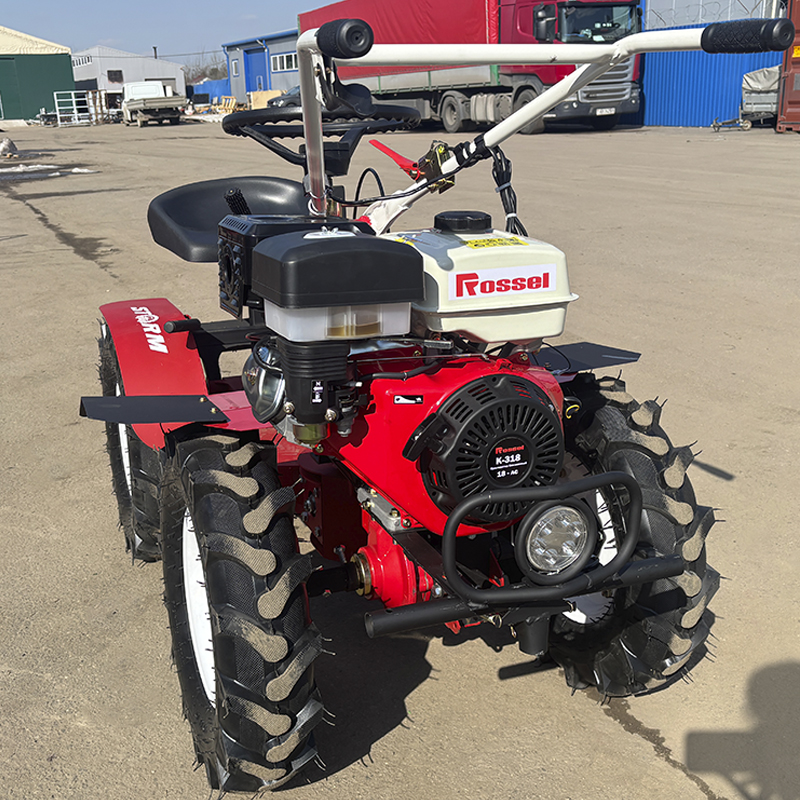Культиватор Rossel K-318 оборудован бензиновым двигателем GX-450 мощностью 18 л.с. с воздушным охлаждением и объёмом 450 см³. Имеет механическую коробку передач с 3 скоростями вперёд и 1 назад, дисковое сцепление, пониженную передачу и масляный бак объёмом 0,7 л.