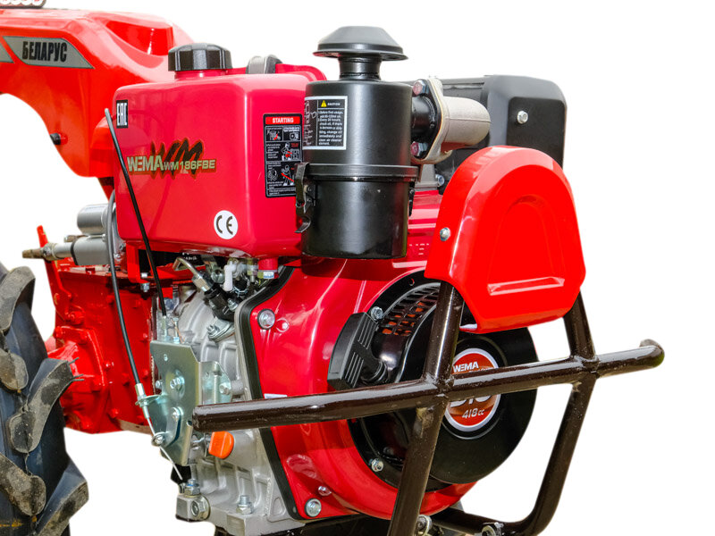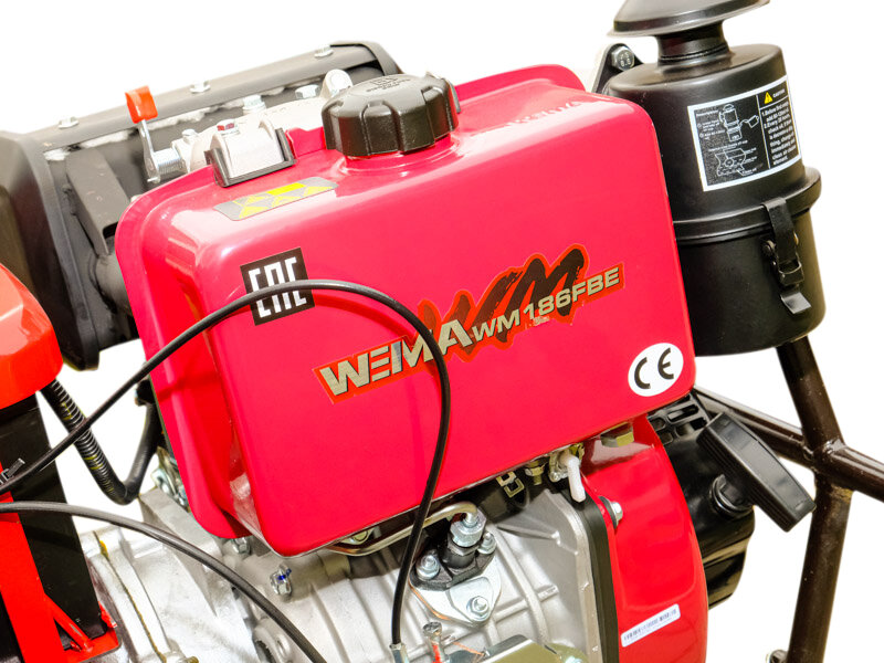 В основе мотоблока лежит одноцилиндровый четырехтактный вертикальный дизельный двигатель WM186FBЕ WEIMA с прямым впрыском топлива и воздушным охлаждением. Запуск двигателя осуществляется с помощью электростартера и актуаторов, что обеспечивает надежность и удобство эксплуатации. Номинальная мощность двигателя составляет 6,6 кВт (9,0 л.с.), а удельный расход топлива не превышает 285 г/(кВт·ч).