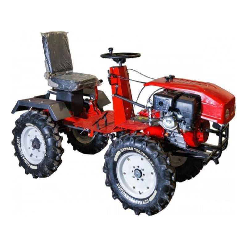 За счет больших колес размером 6.00-12, рулевого управления автомобильного типа и сидения для оператора – работа с мотоблоком существенно упрощается и становится продуктивнее. Рабочее место оператора выполнено максимально эргономично и удобно. Рулевая колонка данного адаптера сконструирована по принципу автомобильной колонки. Это специальный кожух, внутри которого расположен вал рулевого колеса. Функции рулевой колонки состоят в передаче усилий, прилагаемых к рулю, легкого и плавного вращения вилки колеса. На рулевой колонке установлен кронштейн для рычага акселератора. Педаль сцепления расположена слева.