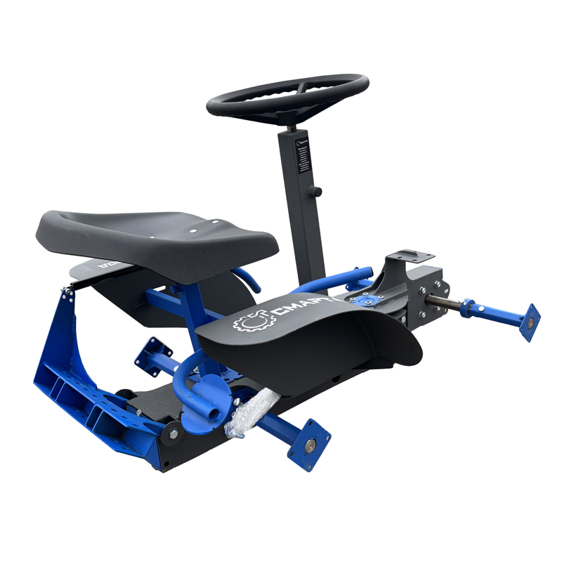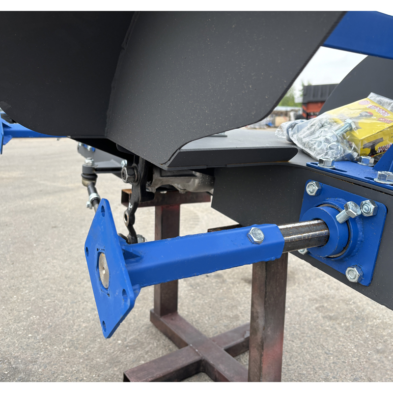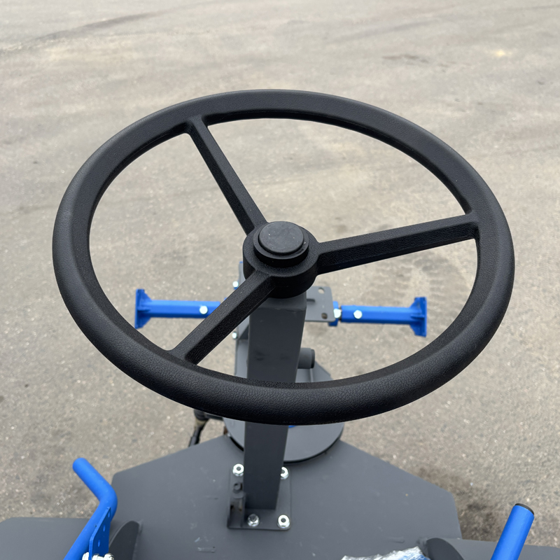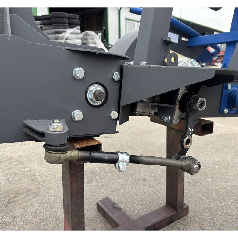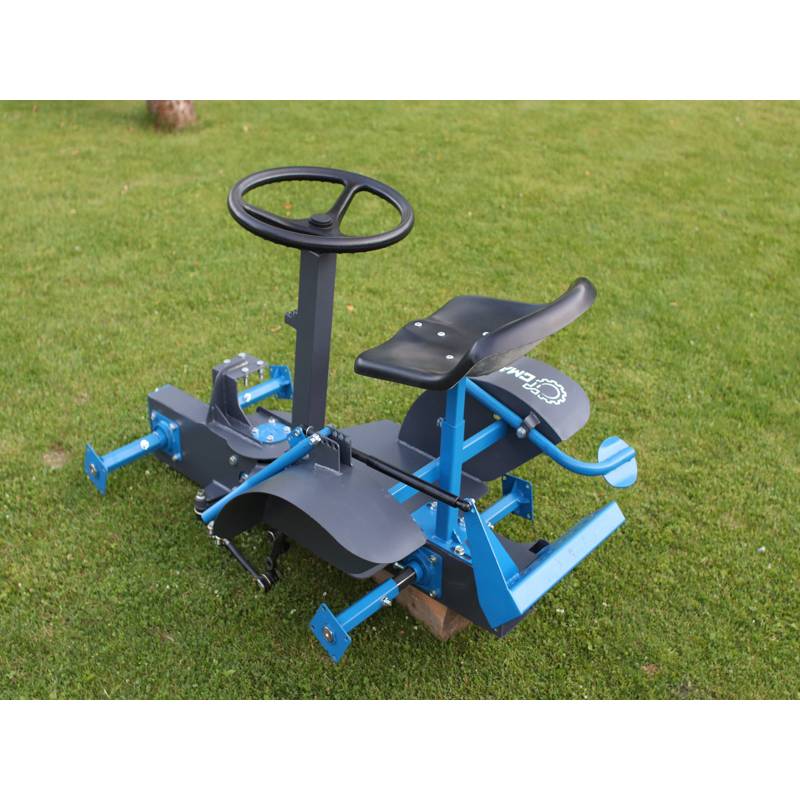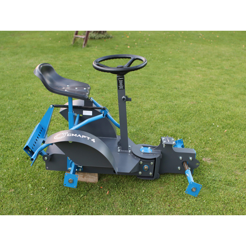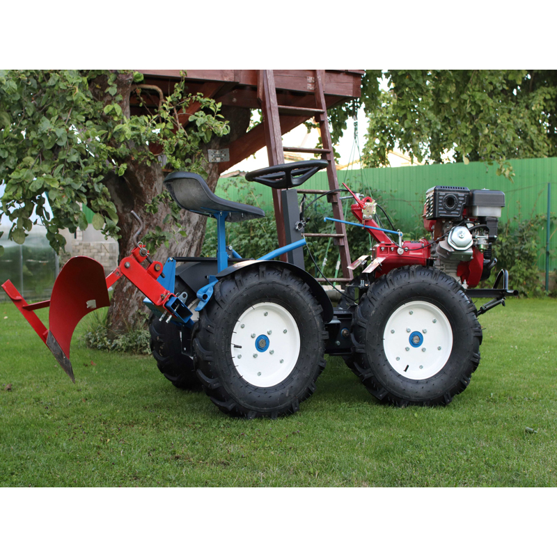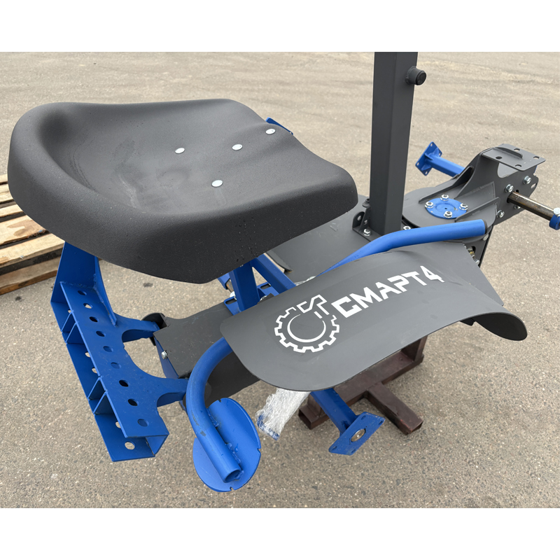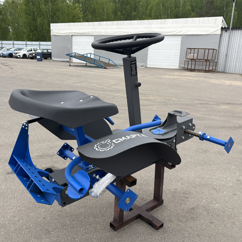 Рама выполнена из листового металла толщиной 4 мм с усиленными узлами на конических подшипниках. Крутящий момент передается через две усиленные цепи, а поворот осуществляется рулевым редуктором с тягой на шаровых шарнирах. Фрикционный тормоз с ручным приводом обеспечивает надежную остановку. Сиденье анатомической формы из стеклопластика делает работу комфортной, а окраска высококачественной автомобильной краской защищает адаптер от внешних воздействий.