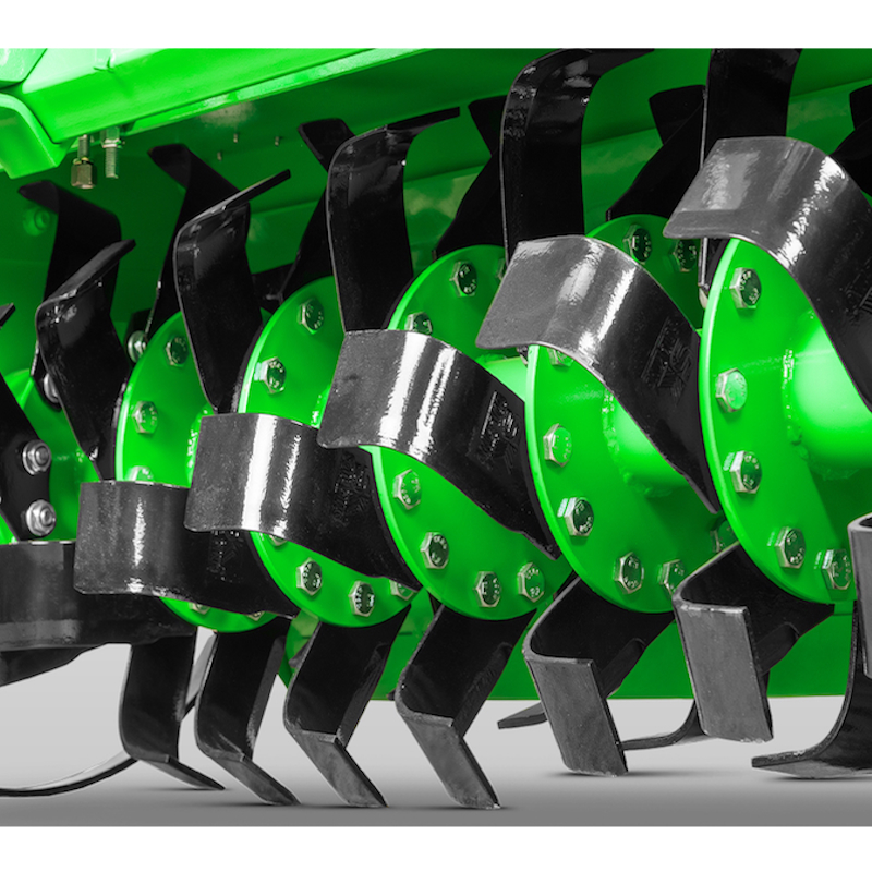Основной рабочий элемент фрезы — ротор с 42 ножами типа C/L, распределенными на 7 секций по 6 ножей в каждой. Это обеспечивает равномерное измельчение и рыхление почвы на ширине 150 см и глубине до 20 см. Привод ротора осуществляется через шестеренчатую трансмиссию с боковым расположением, которая гарантирует надежную передачу мощности и долговечность конструкции. Скорость ВОМ составляет 540 об/мин, при этом обороты ротора достигают 244 об/мин.