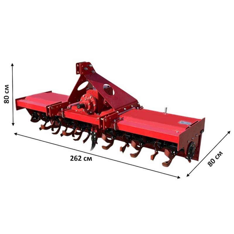 Благодаря трехточечному креплению фреза легко агрегатируется с тракторами различных марок, а прочная конструкция гарантирует надежность и долговечность в работе. Компактные размеры (80 см в длину, 262 см в ширину и 80 см в высоту) и вес 455 кг обеспечивают стабильность и удобство в транспортировке и эксплуатации.