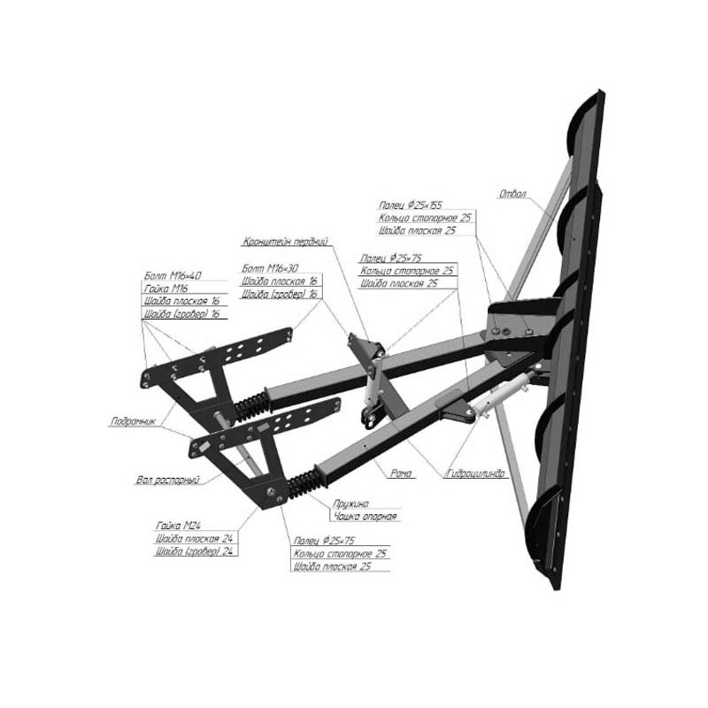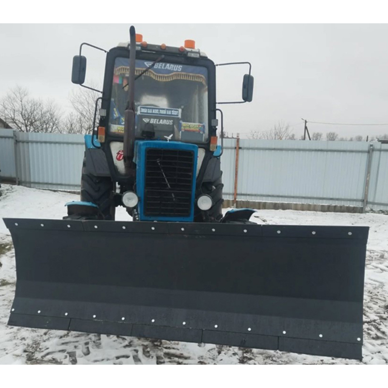 Ширина захвата составляет до 250 см, а высота — 77 см, что позволяет эффективно справляться с большими объемами работы. Гидравлическая система поворота отвала обеспечивает простоту управления и регулировку угла атаки, благодаря чему повышается удобство эксплуатации. Гидравлика питается от системы трактора, обеспечивая надежность работы. Зеркало отвала составляет 4мм. На отвале расположено 6шт. ребер жесткости по 4 мм. Усилительные распорки – швеллер 6,5. Толщина металла отвала: Поворотный кронштейн отвала – 8мм, Рама – труба 80/80/4 мм, Гидроцилиндры 30/50/200, Кронштейны крепления гидроцилиндров – 8мм, Кронштейн передний –8мм, Рама – труба 60/40/4мм.