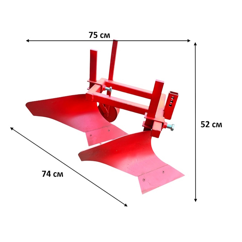 Конструкция плуга продумана для удобства и надежности. Он имеет длину 82 см, ширину 62 см и высоту 60 см, а вес в 26 кг обеспечивает стабильность и легкость в управлении.