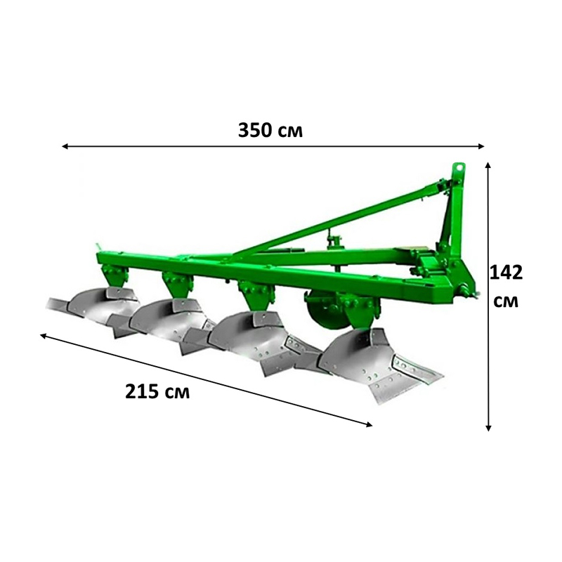 Агрегат оснащён четырьмя корпусами и трехточечной системой крепления, что обеспечивает надёжную и стабильную работу. Плуг весит 640 кг, что делает его достаточно прочным и устойчивым в процессе эксплуатации, а его размеры (длина 350 см, ширина 215 см, высота 142 см) позволяют легко транспортировать и хранить агрегат.