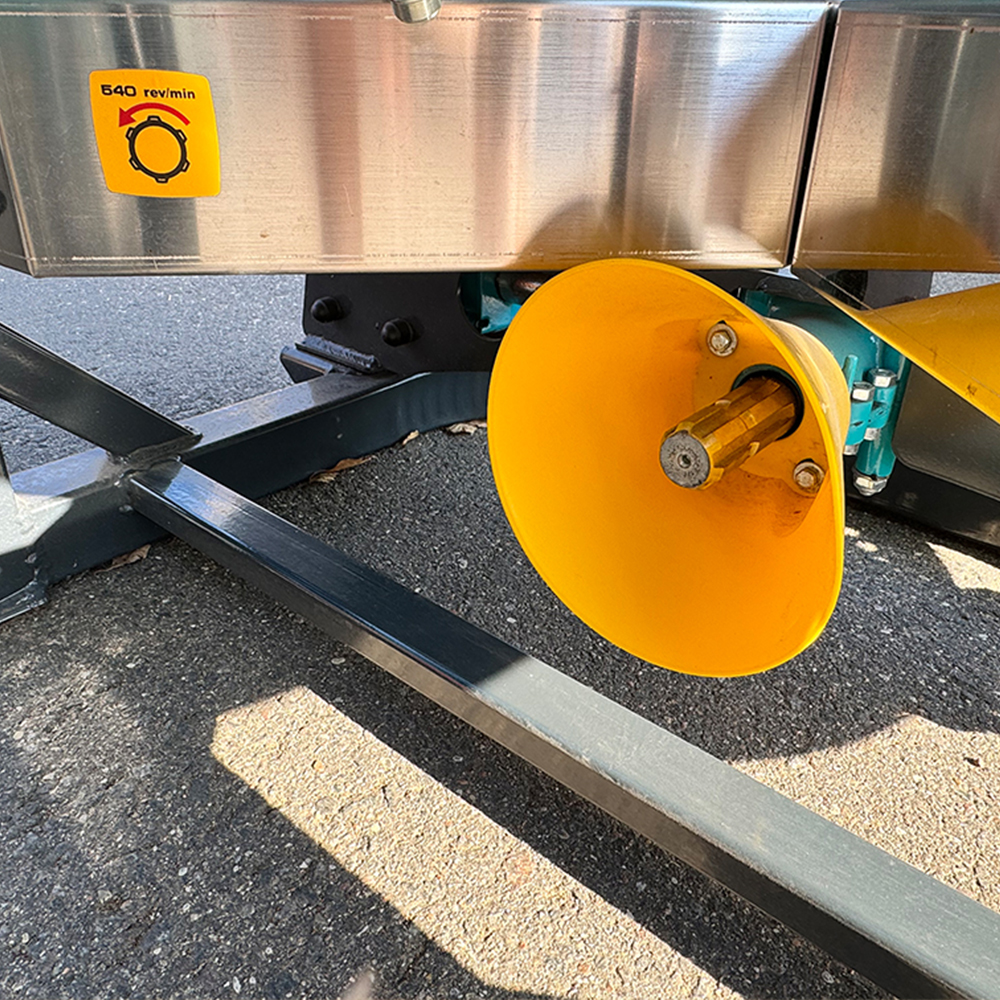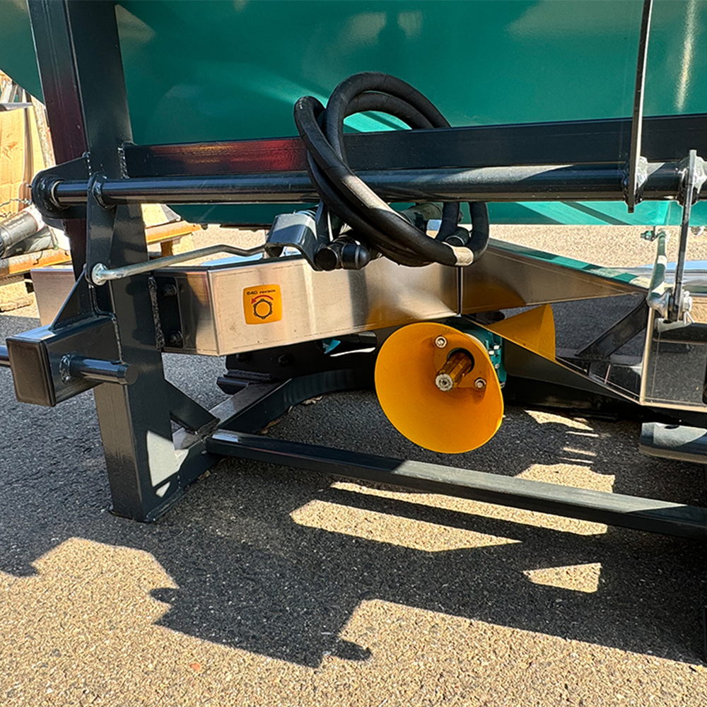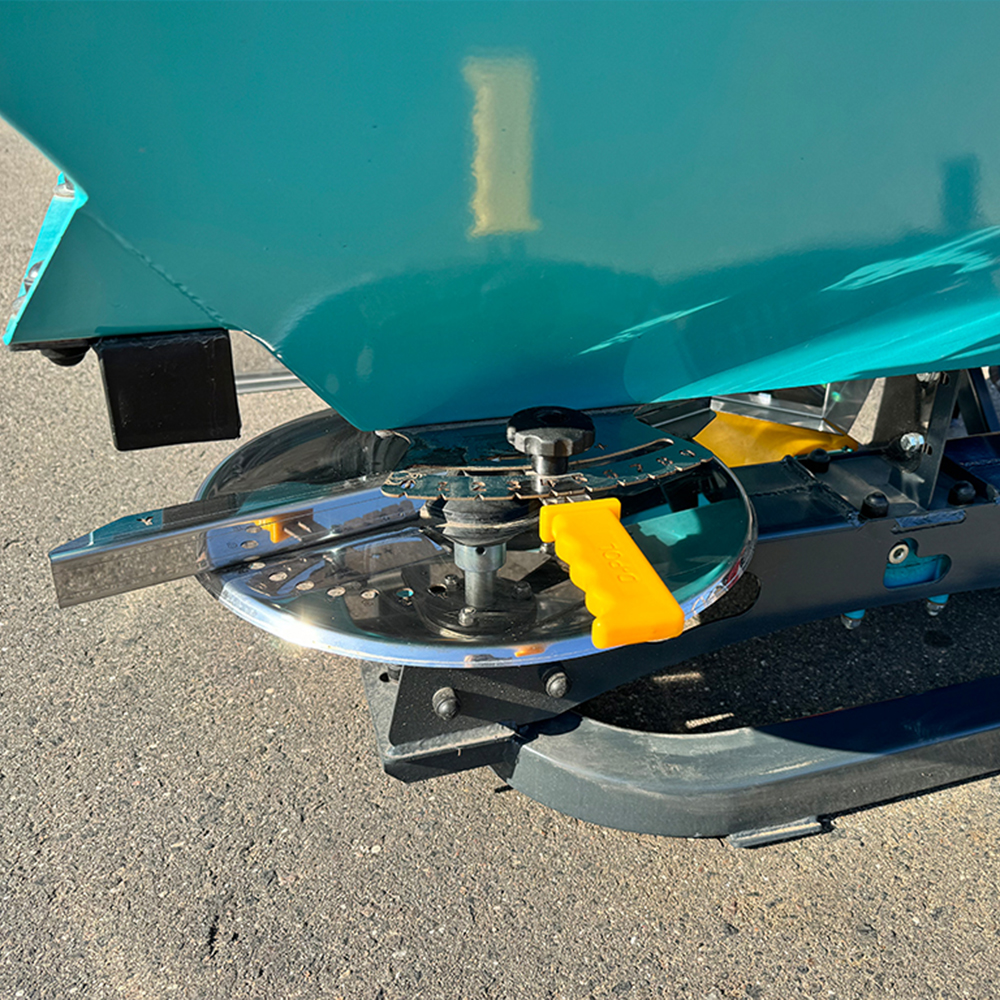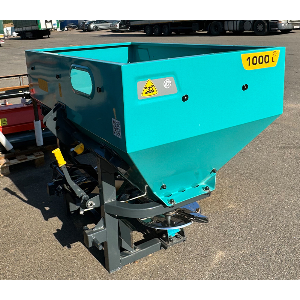 Дополнительным преимуществом является наличие сетки в бункере, которая предотвращает засорение дозирующего механизма, даже если в удобрении встречаются комки. Гидравлический механизм включения позволяет управлять разбрасывателем, не выходя из трактора. Конструкция разбрасывателя компактна и удобна: длина – 170 см, ширина – 100 см, высота – 130 см, вес – 250 кг.