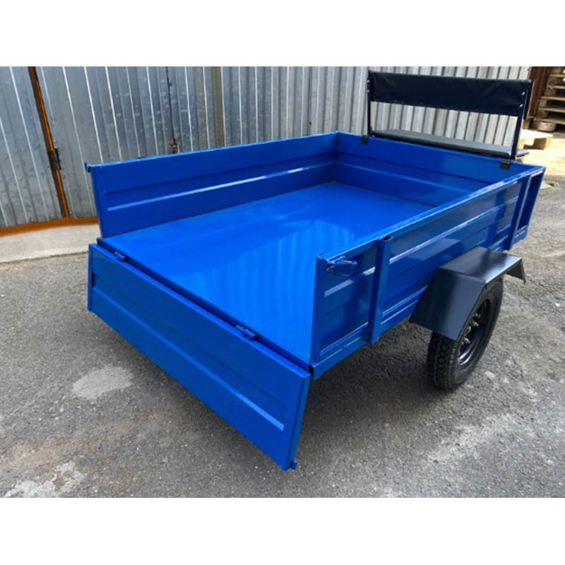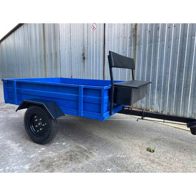Прицеп выдерживает нагрузку до 500 кг. Кузов — металлический, самосвального типа, с откидывающимся задним бортом и Т‑образной осью опрокидывания, что упрощает разгрузку. Высота борта — 28 см. Колёса размером 4.00‑10″ оснащены необслуживаемыми подшипниками и защитными крыльями от брызг. Для безопасности предусмотрен педальный ленточный тормоз.